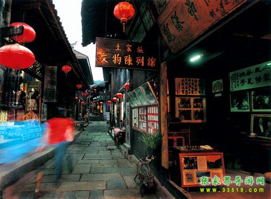 拾級(jí)而上,山路一般的陡峭。從碼頭開(kāi)始綿亙而上的石階,那是一條長(zhǎng)達(dá)五里貫穿古鎮(zhèn)的青石板路,它沒(méi)有名字,于是人們就直接管它叫五里長(zhǎng)街。踏上古街,似乎踩在被悠長(zhǎng)歲月遺落的碎片上面。不知不覺(jué)走到掛有“土家觀瀑吊腳樓”牌匾的民俗博物館前,從手搖腳踏的棉花機(jī)、閹豬鳴號(hào)的羊角到世代相傳的雕花牙床,近百件散發(fā)著鄉(xiāng)土氣息的民間用具,展示著土家族古老豐富的歷史??醋o(hù)人說(shuō),這是一位土家族年輕人爬山涉水收集來(lái)的,靜靜地訴說(shuō)著這個(gè)小村古老的過(guò)去。這棟三層的小樓,一半落在河岸上,另一半?yún)s是由水泥柱支撐著,水泥柱直插河底,任水流日日夜夜地沖刷,小小的吊腳樓仍穩(wěn)穩(wěn)當(dāng)當(dāng)站在那里,任憑時(shí)間的流逝。好聰明的土家人,巧借一片水面,竟建起了如此妖嬈的住房。